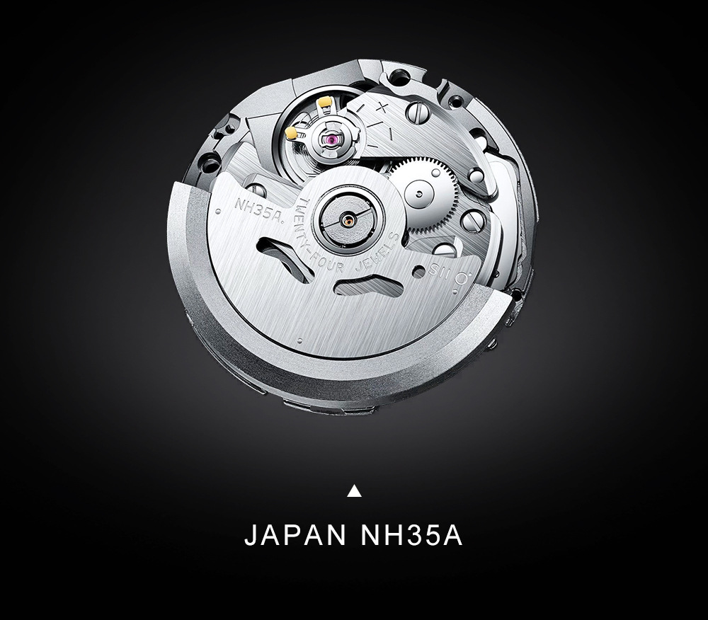 Movement: Seiko NH35A automatic mechanical; runs by hand or wrist movement; never needs batteries & requires little care